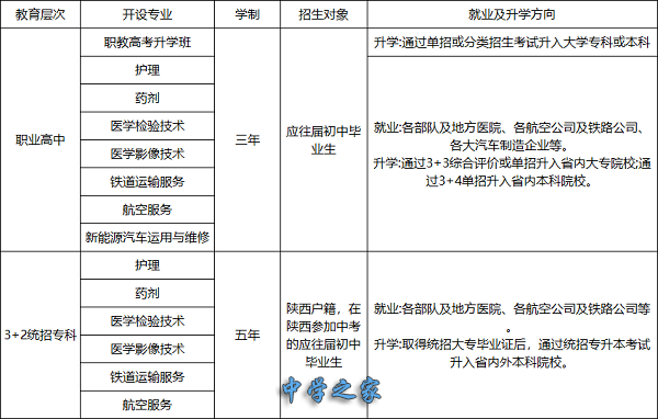 自1994年建校以来,学校已发展成为规模大、师资力量强,设备先进的中、高等职业人才的培养基地,现设有护理、药剂、医学检验技术、医学影像技术、铁道运输服务、航空服务、新能源汽车运用与维修7个热门专业。学校于2002年经陕西省教育厅、陕西省卫生厅联合组织专家评估认定我校为“医药卫生类专业指定招生院校”,毕业生有资格报考职业资格证考试。2008年经西安市教育局专家组评估,我校被评为“西安市重点学校”,2009年被省教育厅评估为“陕西省示范学校”。