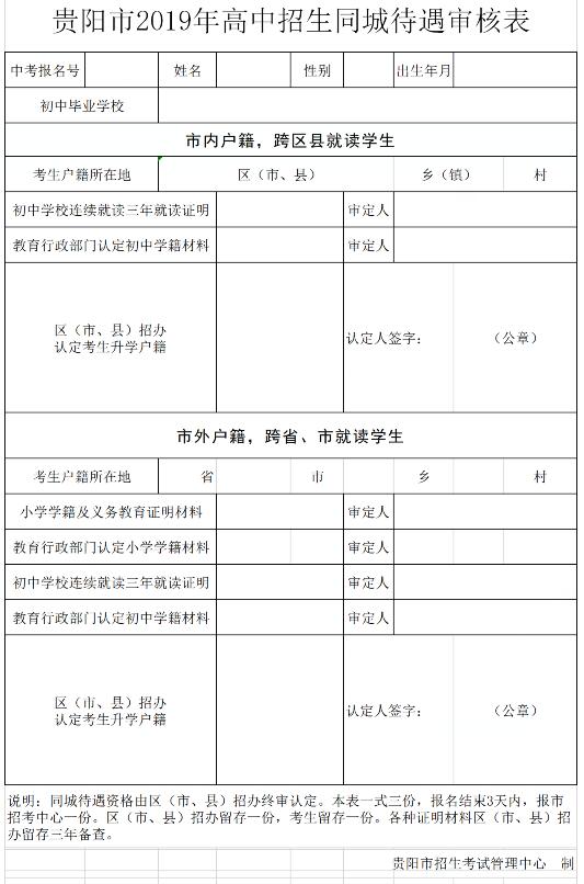 (二)3月上旬,市招生考试管理中心及区(市、县)招办分别召开中考报名工作部署会。市招考中心统一制发《贵阳市2019年中考同城待遇审核表》、《贵阳市2019年中考非同城待遇考生统计表》、《贵阳市2019年中考体考免试申请表》等表册,各区(市、县)招办派人统一领取。各区(市、县)招办、各学校要做好政策传达和政策宣传工作,通过有效方式、有效形式让应届、往届初中毕业生及其家长知晓中考报名有关信息。